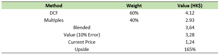 By combining both methodologies using a 60% weighting for the DCF and 40% for the multiples-based valuation, a blended fair value of HK$3.64 per share is obtained. As a standard practice to mitigate potential optimism in the underlying assumptions, a 10% margin of safety is applied to ensure a more conservative outlook. Even after this adjustment, the stock continues to offer an upside potential of approximately 165% relative to current price levels.