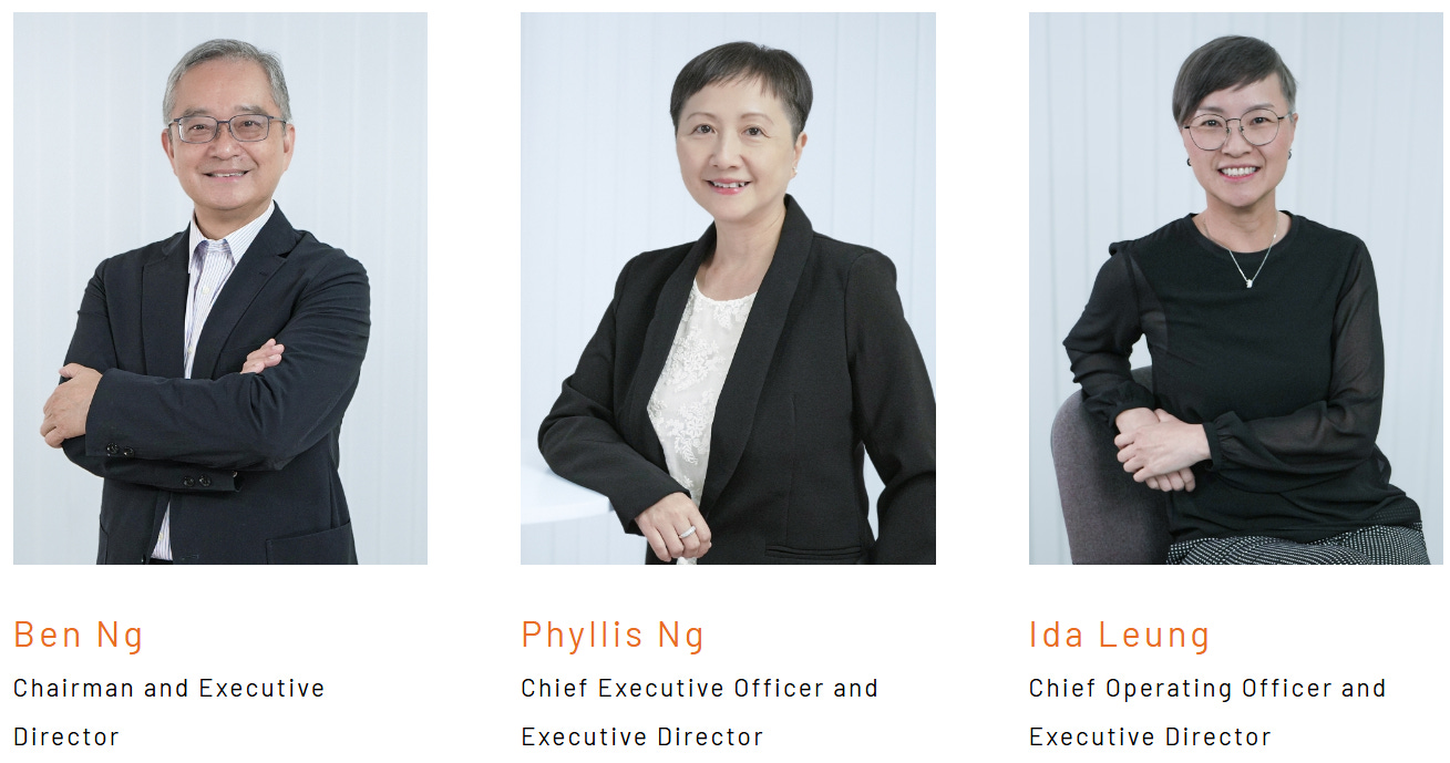 The Group’s executive management blends founder-led continuity with professional expertise. Phyllis Ng (Ng Yuk Kwan), Ben Ng’s sister, serves as Chief Executive Officer and Executive Director, overseeing strategy, operations, and organisational development. Ida Leung, Chief Operating Officer and Executive Director, manages operational delivery across all service segments.